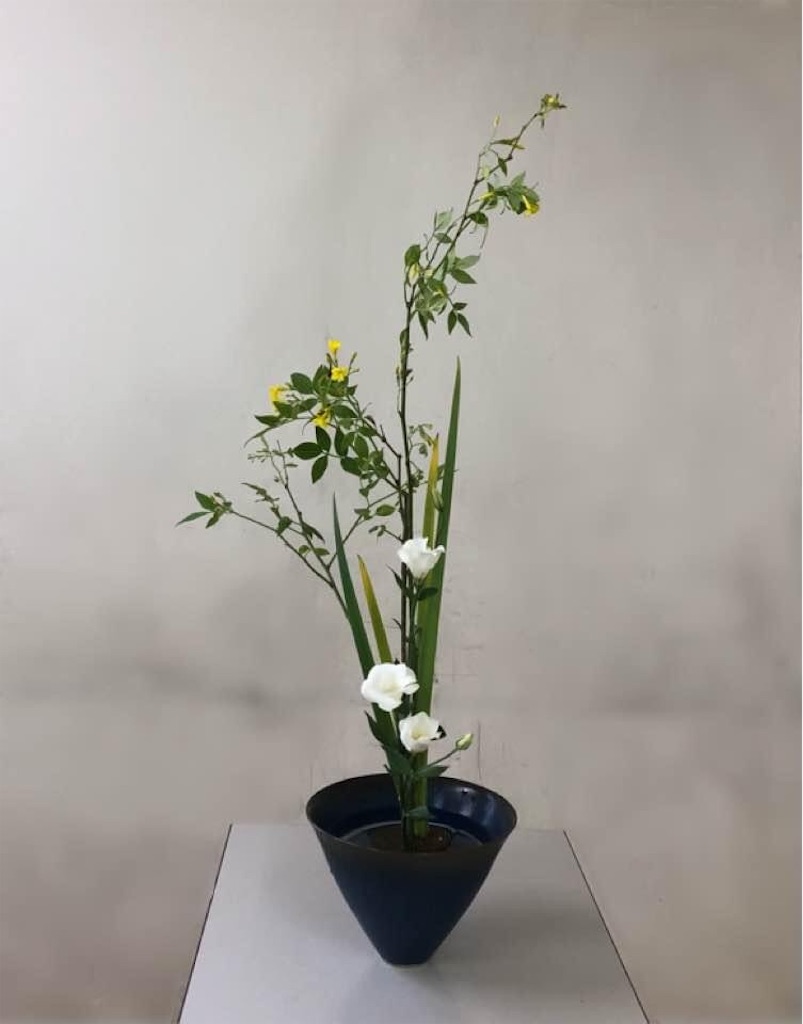 2021-05-02 三種生け(池坊 生花) いけばな 今回の生花は黄色い花の咲いている枝を切って形をつける事が大変でした。 中々好きないけばなに仕上がりました。 横から見た写真です。 この花器も中々良いですね〜